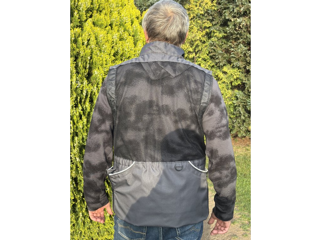 Lehká vesta bez rukávů s límcem ze síťoviny.Velké kapsy 2x vpředu, 2x kapsa nahoře,1x velká vzadu s polokroužkem .